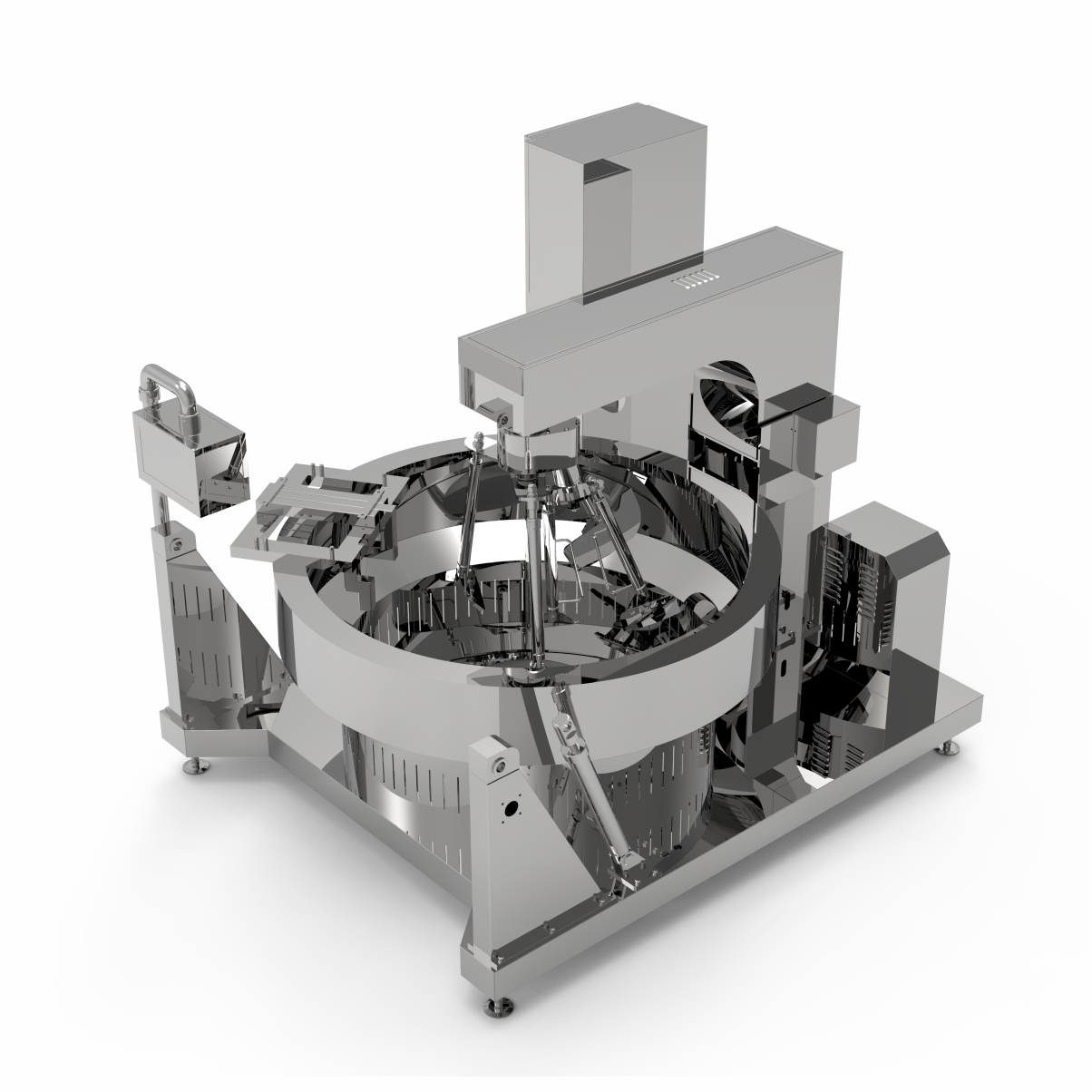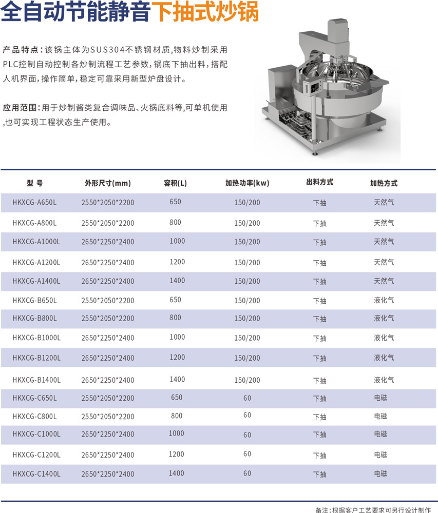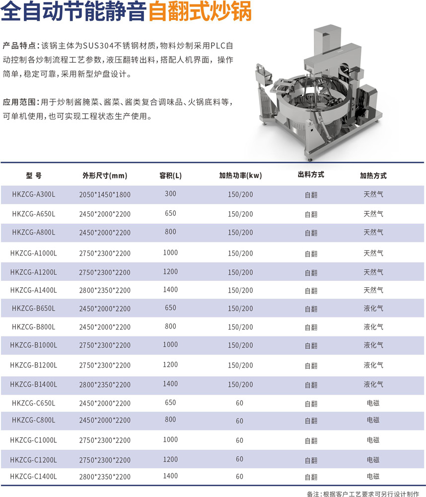 該鍋主體為SUS304不銹鋼材質(zhì),物料炒制采?PLC?動控制各炒制流程?藝參數(shù),液壓翻轉(zhuǎn)出料,搭配?機界?, 操作簡單,穩(wěn)定可靠,采?新型爐盤設計。